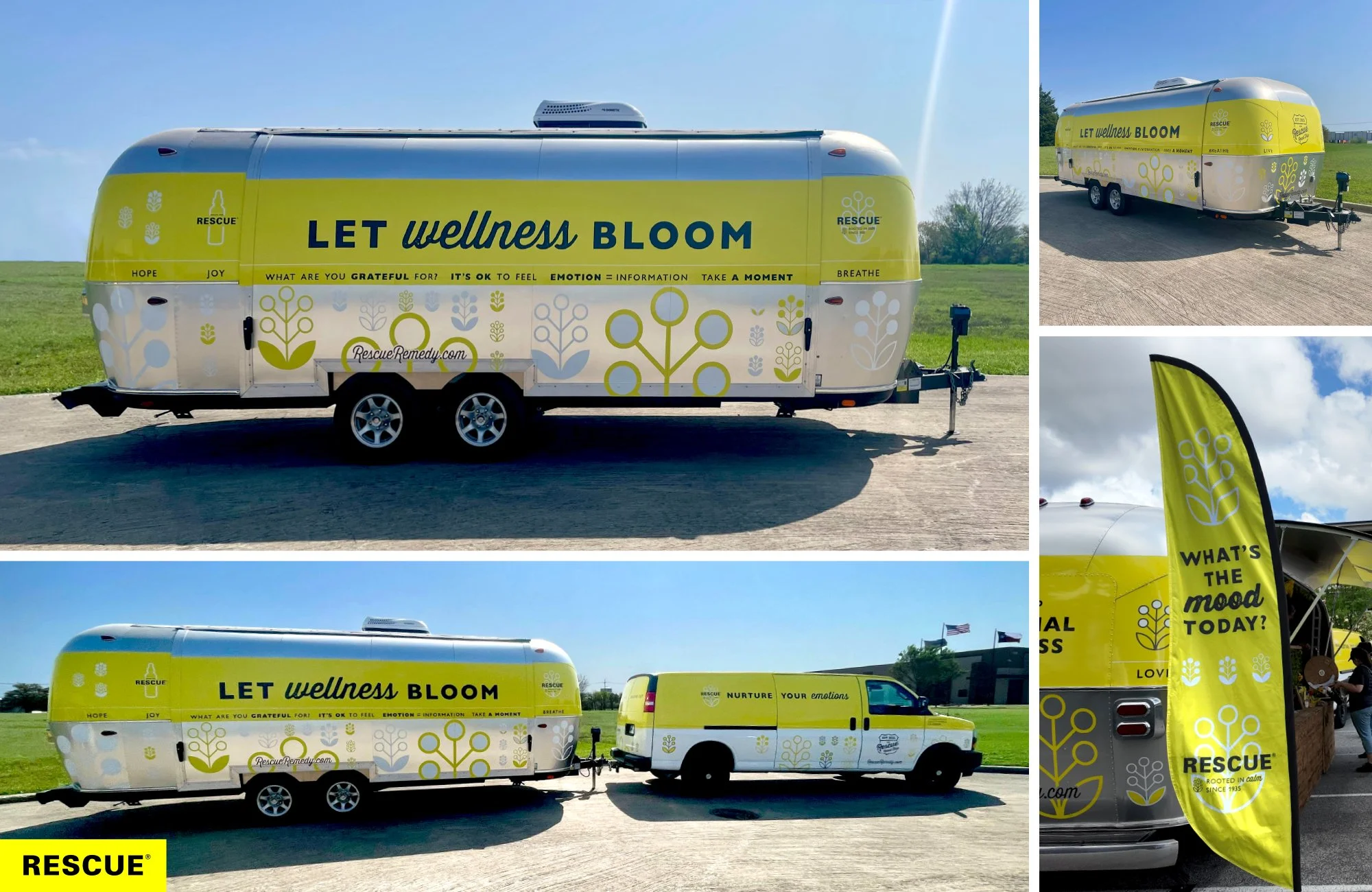 The aluminum Airstream and van were wrapped in Rescue’s iconic sunshine yellow, logos, graphics and phrases—then driven from Texas to Pennsylvania over an 8-week period in the Spring of 2025. The goal? To spread positivity across America while bringing attention to the value of emotional health.